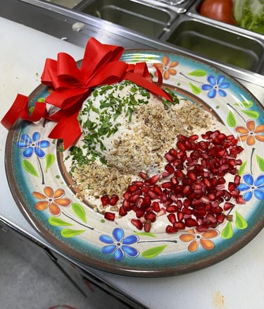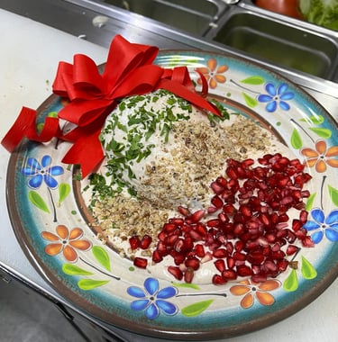 Chile poblano relleno de picadillo, bañado en nogada y granada.